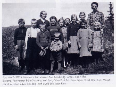 Lärarinnor från vänster: Anni Sandvik g. Grop och Inga Villför. Eleverna från vänster: Börje Sundäng, Karl Kuni, Gösta Kuni, Nils Pörn, Ruben Studd, Doris Kuni, Margit Studd, Aurelia Hedvik, Elly Berg, Ruth Studd och Ragni Kuni.
