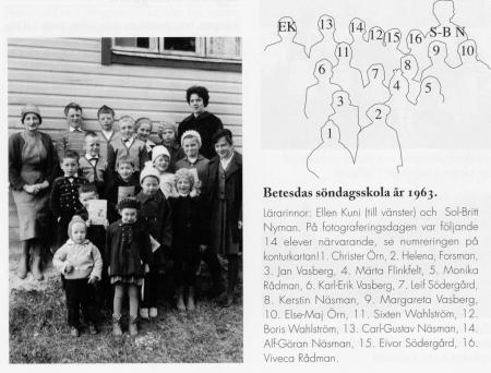 Lärarinnor: Ellen Kuni (till vänster) och Sol-Britt Nyman. På fotograferingsdagen var följande 14 elever närvarande, se numreringen på konturkartan! 1. Christer Örn, 2. Helena Forsman, 3. Jan Wasberg, 4. Märta Flinkfelt, 5. Monika Rådman, 6. Karl-Erik Wasberg, 7. Leif Södergård, 8. Kerstin Näsman, 9. Margareta Wasberg, 10. Else-Maj Örn, 11. Sixten Wahlström, 12. Boris Wahlström, 13. Carl-Gustav Näsman, 14. Alf-Göran Näsman, 15. Eivor Södergård, 16. Viveca Rådman.
