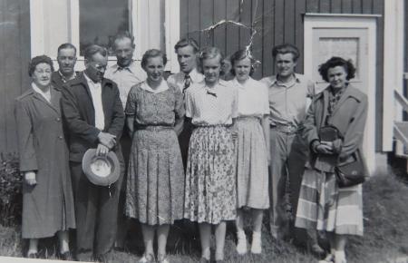Fr. vänster: Hilma Sticksund från Koskö gift med Albert Frantz, Arvid Fors f. Frantz, Albert Frantz, Johannes Nyman, Sigrid Nyman, Erik Nyman, Karin Nykvist, Gunvor Forsell, Gösta Forsell och Rose Frantz gift med Johannes.