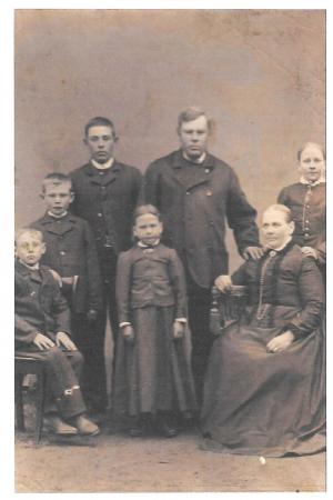 Till höger sitter Maria Johansdotter Murkais f. Nygård 1847 (Lappas i Kvevlax), hennes man i gifte nr 2 Abraham Herman Murkais f. Klockars från Höstves står i mitten. De fick åtta barn. Maria Josefina (Marias dotter från första äktenskapet) står bakom sin mamma. Hon gifte sig med Erik Simons som tog namnet Murkais. De andra har inte kunnat med säkerhet identifieras. Källa: namnen kommer från Rågens och fjärdarnas rike 2024. Bilden som har donerats av Bjarne Murkais finns i Evelina Wilsons familjealbum.