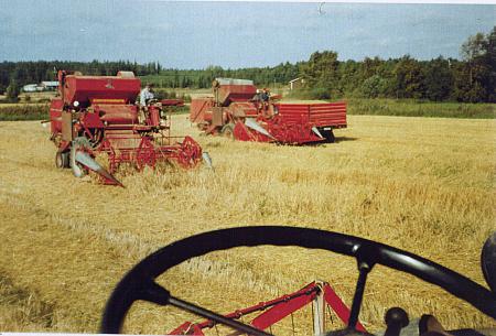 Robert och Herbert Rabbs tre Bautz skördetröskor på hemskiftet i Södra Vassor. Förare var Robert Rabb, Herbert Rabb, Sigfrid Mälsor, Lars Småros och Kurt Östman. Bautz tröskor såldes av Gustav Svanljung i Vasa. Småningom började bönderna skaffa egna tröskor.
