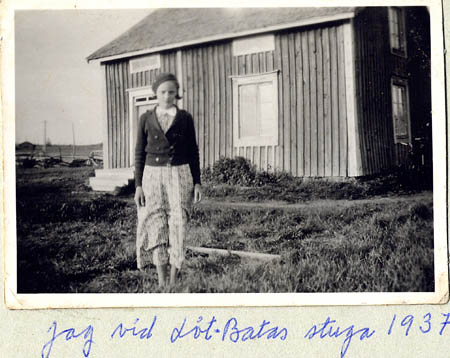 Beata Östmans stuga ”Luöt-Baat”. Framför stugan står Ester Lundberg. Alef Heir byggde senare på tomten. Se VBH III sid 192.