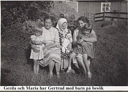 Maria Åberg med barn och barnbarn vid Hellaris: Birgitta Wiik, Gerda Åberg, Maria Åberg f. Södergård 1886 med Bjarne Wiik och Gertrud Wiik f. Åberg med Barbro Wiik i famnen, vid ”Hellaris”