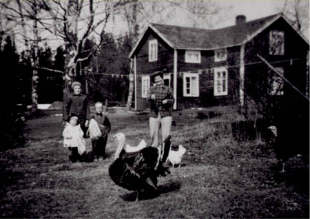Emil Hinders gård i Lillön. Från vänster: 1. Barbro Hinders g. Eriksson. 2. Göran Hinders. 3. Gretel Hinders g. Mantere 4. Ester Hinders f. Lundberg längst till höger (mor). Gården på Lillön: f.d. Anders Udds gård, f.d. Karl Phils.