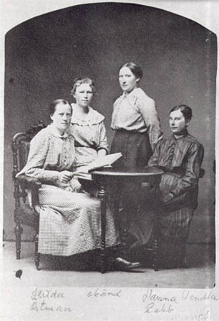 Fr. v. Hilda Östman g. Fant, systrarna Maria Rabb (till Amerika), Hanna Rabb (Nyåkers) och Vendla Smeds = ”Tåppis Vendla”.