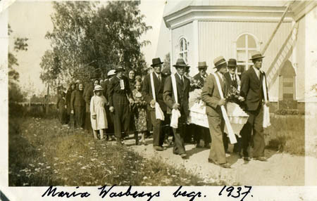 Maria Wasberg f. Lundqvist begravs 1937. Bärare: Alfred Wasberg, Oskar Wasberg, Johannes Wasberg, Emil Wasberg, Isak Wasberg, Hugo Vasberg, mellan Oskar och Johannes går Wilhelm Wasberg.