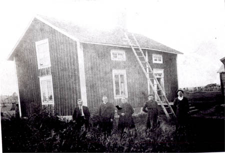 Anders Johan Johansson Rabbs stuga på Sandåsen. Mickel Sandén byggde i stugan 1918. På bilden fr. v. Johannes Andersson Rabb, Anders Johan Rabb, Fredrika Rabb f. Wasberg, Irene Rabb, Edla Rabb på Sandåsen