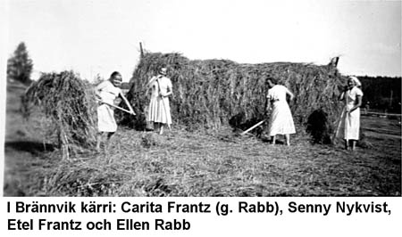 I Brännvikkärret: Carita Frantz g. Rabb, Senny Nykvist, Etel Frantz, och Ellen Rabb. Ernst Frantz var en av de få som torkade höet på hässjor de andra störade höet.