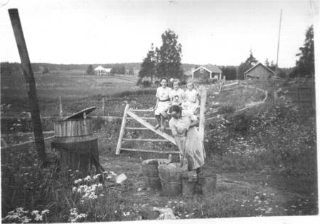 Ingrid Åberg kokar och rör till grismat nedanför gården (vid grinden till övran oåkrin). I bakgrunden Hellaris och Öirin. På grinden Vivan Åberg, Eivor Åberg och Gunlis Nykvist.