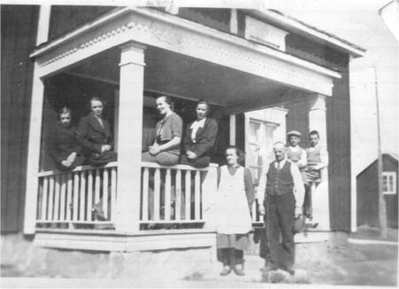 Otto Östmans och Jenny Östmans veranda på Norrstu med barn. Gunhild, Wivi, Ingrid, Alice, Nils och Kurt.