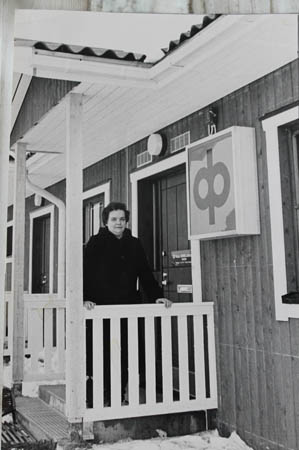 Kontorsföreståndare Carita Rabb framför ingången till Andelsbankens kontor i radhuset vid Sandåsvägen. Kontoret fanns tidigare hos Jakob Östman/Otto Östman på Norrstu, hos Fritjof Wik på Laggen, hos Emil Rabb på Löte, hos Carita och Gunnar Rabb vid Smedis och i Radhuset på Sandåsvägen.