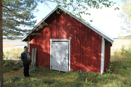 Israel och Jakob ”Jeck” Hellmans båthus. Huset står på Marita och Olof Åströms tomt. Alf Hellman står framför huset.