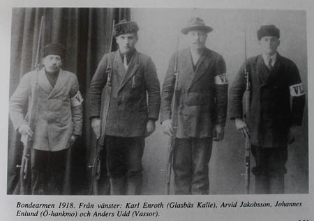 Skyddskårister 1918. Karl Enroth (Glasbäs Kalle), Arvid Jakobsson, Johannes Enlund (Ö-Hankmo) och Anders Udd (senare Uddström, Vassor).