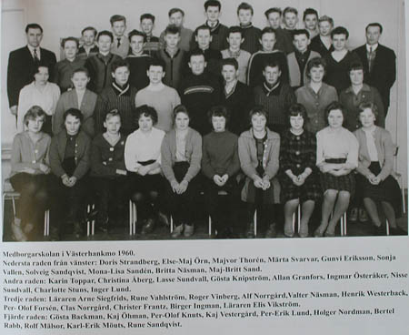 Medborgarskolan i Västerhankmo 1960. Från Vassor: (Namn finns i bilden) Doris Strandberg, Else-Maj Örn, Sonja Wallén, Christina Åberg, Rune Wahlström, Per-Olof Forsén, Christer Frantz, Kaj Öman, Bertel Rabb och Rolf Mälsor.