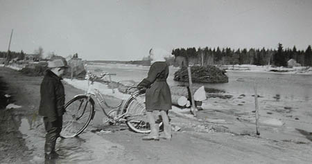 Översvämning i påsktider på 1960-talet i Kunisundet. Påskbrasan mitt i bild. Leif Södergård och Eivor Södergård på cykel. Bergis (Evert Bergs gård från 1920-talet) till vänster och Irene Forsmans lada till höger.