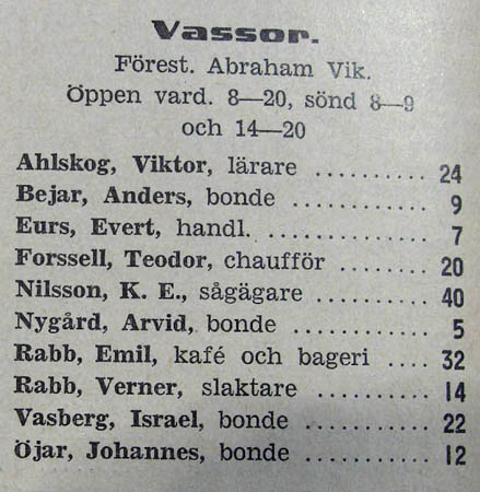 Wasa telefonkatalog 1934. Telefoner anslutna till Vassor centralen, föreståndare Abraham Wik: Victor Ahlskog, Anders Beijar, Evert Eurs, Teodor Forssell, K. E. Nilsson, Arvid Nygård, Emil Rabb, Verner Rabb, Israel Wasberg och Johannes Öijar.