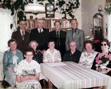 Ester Lundberg bjöd till 60-årskalas sommaren 1982. Stående fr. v. : Arvid Forsén, Einar Nyman, Emil Rabb och Alfred Rabb. Sittande: Ester Siegfrids, Ester Lundberg, Hilda Björklund, Marie Nyman, Hanna Wik, Tekla Klemets och Ester Rabb.