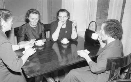 Vasabygdens marthadistriktsförbunds årsmöte i Vasa stadshus. De kaffedrickande damerna är fr. v. Anni Rådman (Kuni), Etel Mattlin (Maxmo), Elna Finnström (Maxmo) och Ester Örn (Kuni).