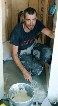 Jan-Erik Hinders lägger golv i ett våtutrymme hos Åbergs på Västerbacken.