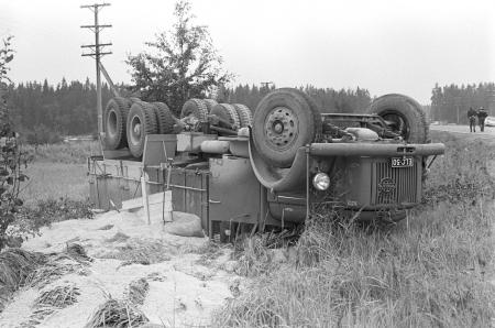 En Volvo lastbil på väg norrut, lastad med havre, körde av vägen mitt på torrläggningen i september 1970. Alf Hellman och Henrik Örn "kårjade" upp säden.