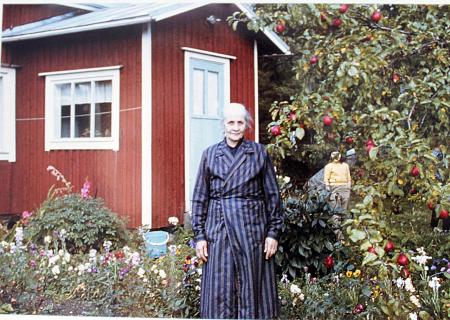 Ester Uddström f. Grönvik (1896–1973) framför stugan på Lillön. Hon var Alice Uddströms mor och hennes man Anders Udd/Uddström drunknade vid Björnholmens norra rev tre månader innan Alice föddes.