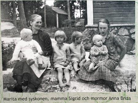 Anna Brita Rabb (född Udd, 1883) med dottern Sigrid Nyman (f. 1911) och barnbarnen vid ”villan” på Bjäänesi/Bergnäset. I Anna Britas famn Bror Nyman (f. 1935), intill dem Gunhild Nyman (f. 1931), Anne Nyman(f. 1933) och Sigrid Nyman med Marita Nyman (f. 1935). Sigrids man Gunnar Nyman (från Vasa, 1899–1936) hade avlidit i tuberkulos och Brors tvillingsyster Marita adopterades av farbrodern Harry Nyman som bodde i Åbo.
