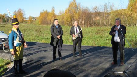 Invigningen av nyasfalterad Vassorväg och lekparken. Medlem av Österbottens försvarsgille Erik Berg, riksdagsman Joakim Strand, musiker Yngve Lithén och samällighetens ordförande Stig Beijar.