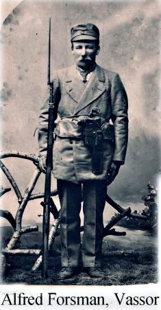 Alfred Forsman f. 1877, han bodde i Utibyn i Vassor och var aktiv i vapensmugglingen och deltog frihetskriget. Mausern hade han fått som erkänsla för sina insatser 1917.