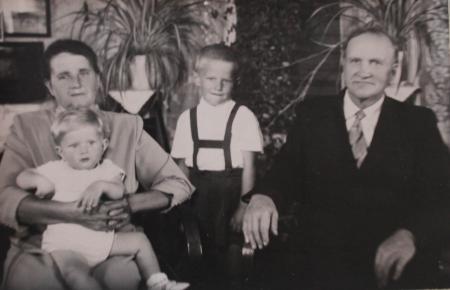 Elsa och Verner Vestergård hemma på Nyback med barnbarnen Lars (född 1953) och Roland (född i Vassor på nyårsaftonen 1949, strax innan han och föräldrarna Sven och Greta flyttade till Örebro i Sverige).