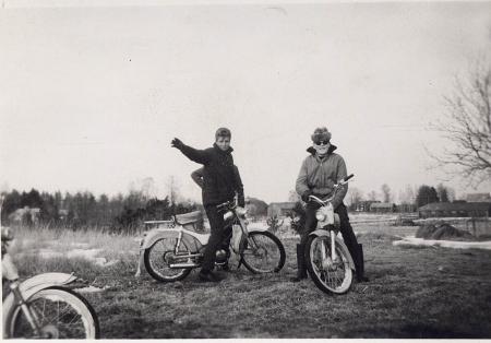 Tre pojkar på moped: Lars Öhrn och Dan Skog. Den tredje som är skymd bakom Lars är troligen Håkan Lundberg. Bilden är tagen från Bodstranden mot byn. Sanfrid Hinders svinfarm till höger, Vasbergs stuga till vänster om Hinders och mellan mopedisterna syns husen från Storbackas.