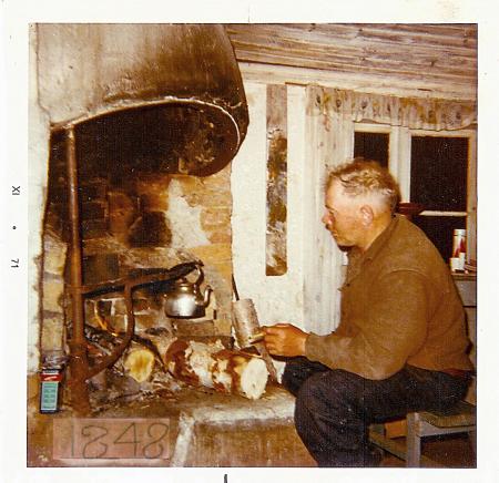 Jakob Hellman "Jeck" framför spisen i Hellmans fiskestuga på Aspskärsgrundet i Mickelsörarna i början av 1060-talet. De ljusblåa pallen som Jeck sitter på finns fortfarande kvar (2023). Alf Hellman har senare renoverat stugan. Då den gamla spismuren revs hittades en tegelsten med årtalet 1848.