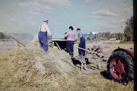 Det märkliga är att Johannes står på "fel" sida om remmen och remskivan. Kan det vara fråga om ett som kallades "Karelatröskverk".