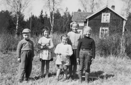 Stefan Nissfolk, Marianne Wiik, Vivian Heir, Lisen Heir och Gretel Hinders. Stugan i bakgrunden är Anna Josefina Heirs, "Fina" Heir f. Björkbacka från Maxmo (Alef Heirs mor). Stugan fanns på Lillön och revs på 1970-talet. (se VBH III s. 240)
