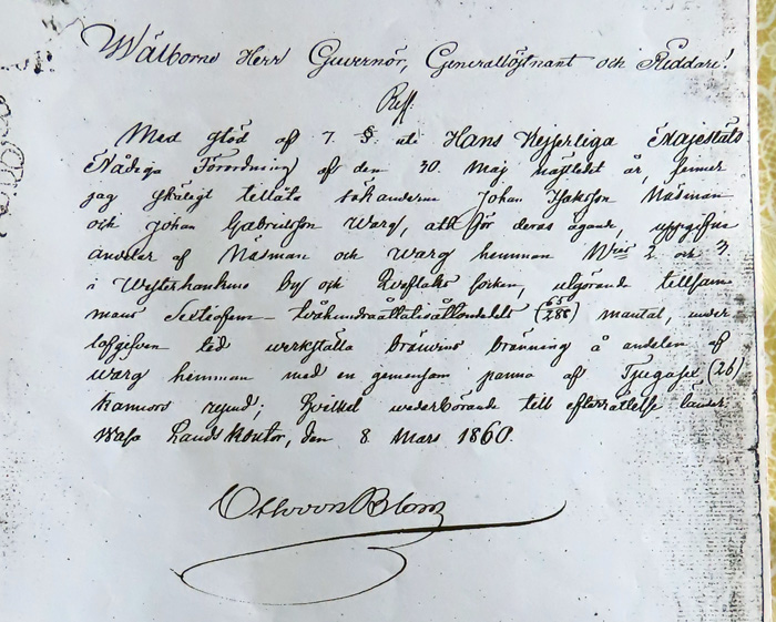 Åren 1800 till 1865 avgjorde jordinnehav möjligheten att få tillstånd till brännvinsbränning. Det var troligen orsaken till att Warg och Näsman gjorde en gemensam anhållan och fick tillstånd till bränning med en panna av 26 kannors rymd (1 kanna = 2,65 liter). Deras lagliga verksamhet blev inte långvarig eftersom brännvinsbränning förbjöds 1865.